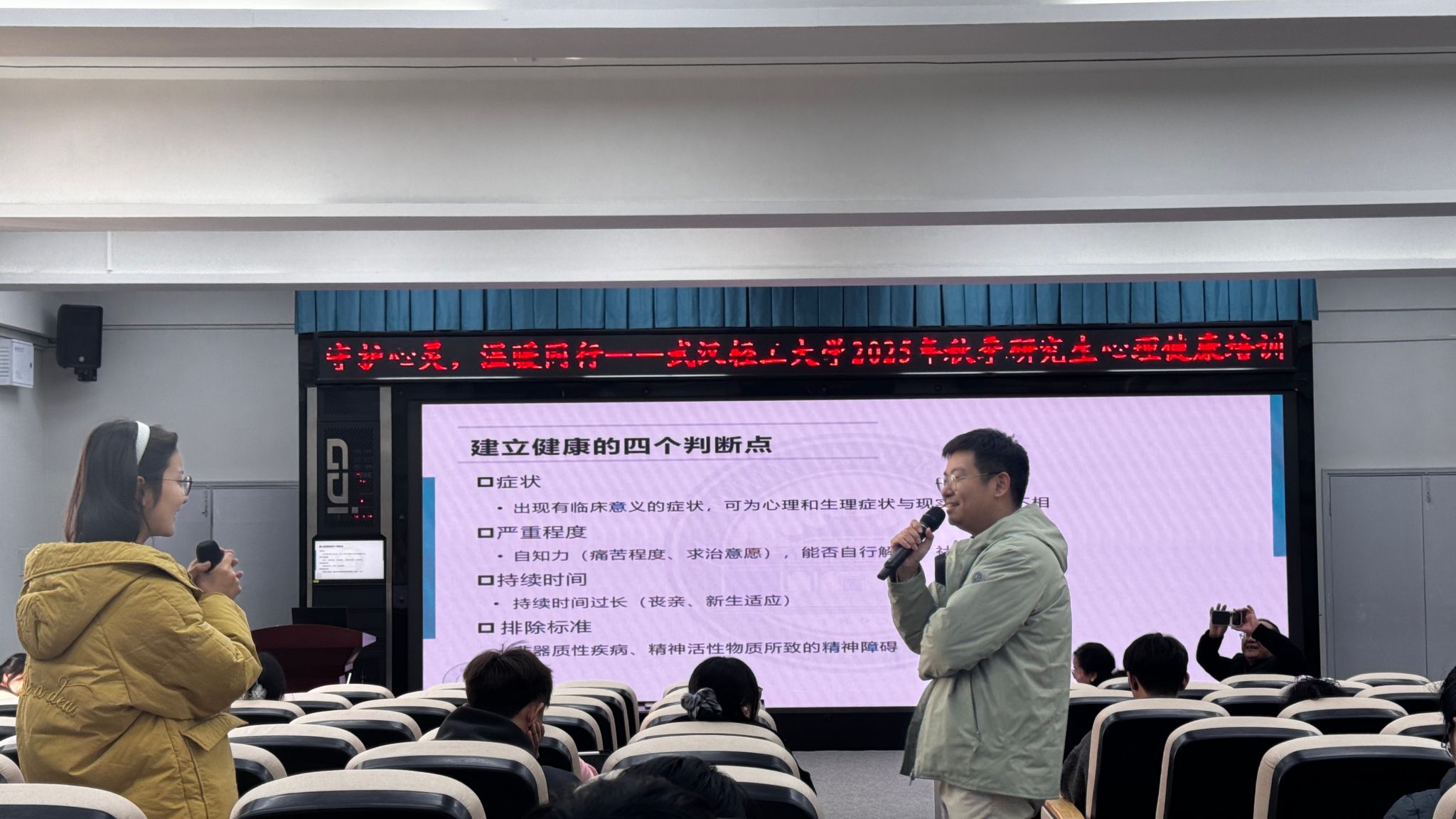 为切实关注研究生心理健康,提升师生心理危机识别与干预能力,11月27日,我校在常青校区积学楼209教室成功举办秋季研究生心理健康教育专题讲座。本次培训以“做班级心理的守望者——心理危机识别”为主题,特邀武汉大学心理健康教育中心主任、国家二级心理咨询师马鑫老师担任主讲。研究生辅导员、心理委员及部分学生代表共同参加。